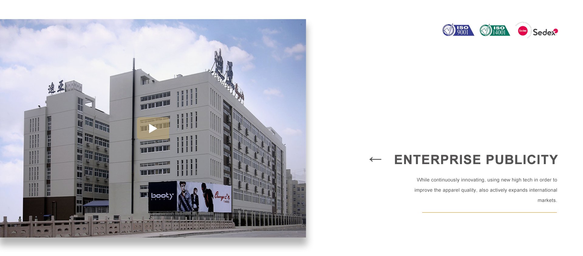 浙江迪亞服飾有限公司于1998年在世界時尚品牌之都——法國巴黎二區應運而生。同年,在浙江省甌海經濟開發區東方南路28號設立服裝制造工廠。公司集服裝設計、生產、營銷、品牌于一體,在不斷創新、采用高新技術提高服飾質量的同時,積極拓展國際市場,海外營銷部長期與各大國際著名品牌保持非常緊密的合作關系。